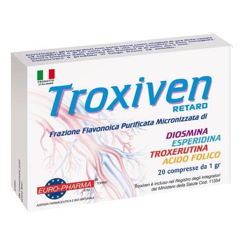 TroxivenRETARD Descrizione Integratore alimentare di diosmina, esperidina, rutina e acido folico. Il folato contribuisce alla normale emopoiesi e al normale metabolismo dell'omocisteina. Ingredienti Diosmina. esperidina, rutina, idrossipropilmetilcellulosa; agenti di carica: cellulosa microcristallina; agenti antiagglomeranti: magnesio stearato vegetale, biossido di silicio; acido folico. Senza glutine e lattosio. Caratteristiche nutrizionali Valori medi per 1 compressa Diosmina 300 mg Esperidina 300 mg Rutina 300 mg Acido folico 200 mcg (100% VNR*) *VNR: Valori Nutritivi di Riferimento Modalità ...
